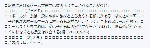 | (4)実践提案…… | 体育科の実践に関わって,新たな実践の方向性について提案しているもので,教材や指導法の開発,単元構成の提案,カリキュラムの目標と評価規準の開発などを含み,学術的な根拠に基づいてなされるものを指しています. |